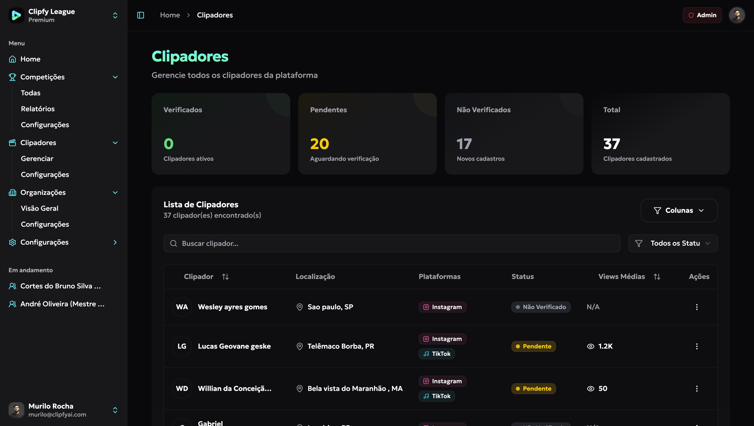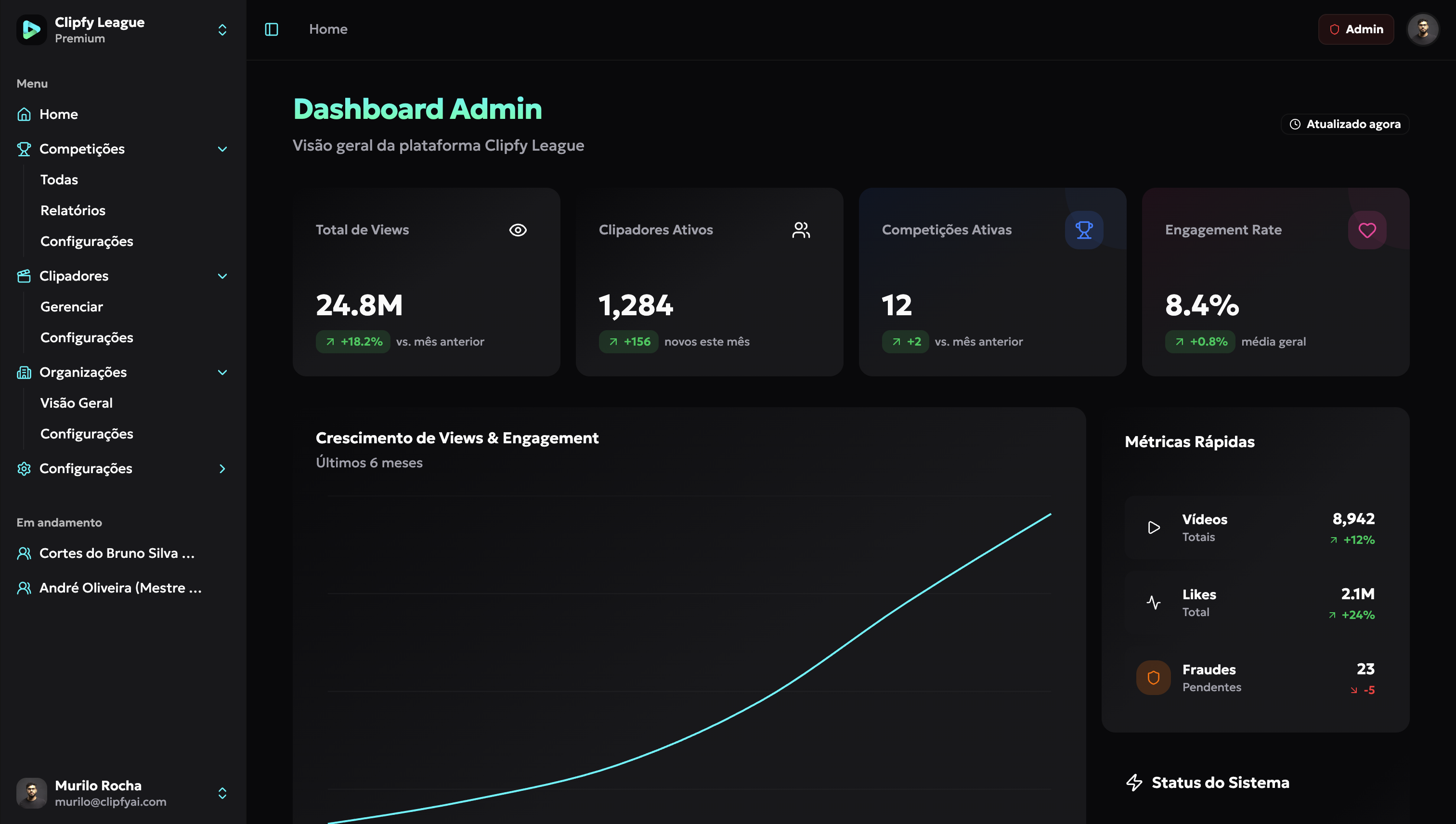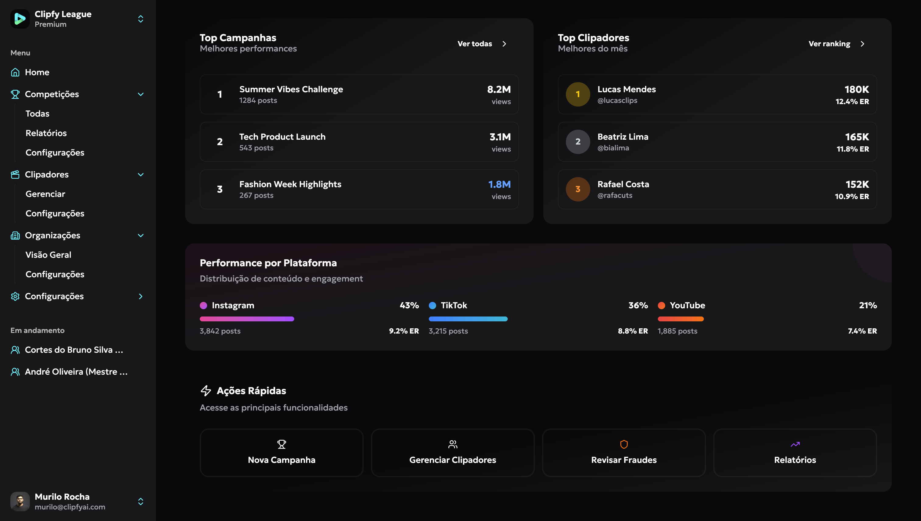 A Clipfy League valida os envios, atualiza o leaderboard, acompanha engajamento e gera relatórios semanais e final.