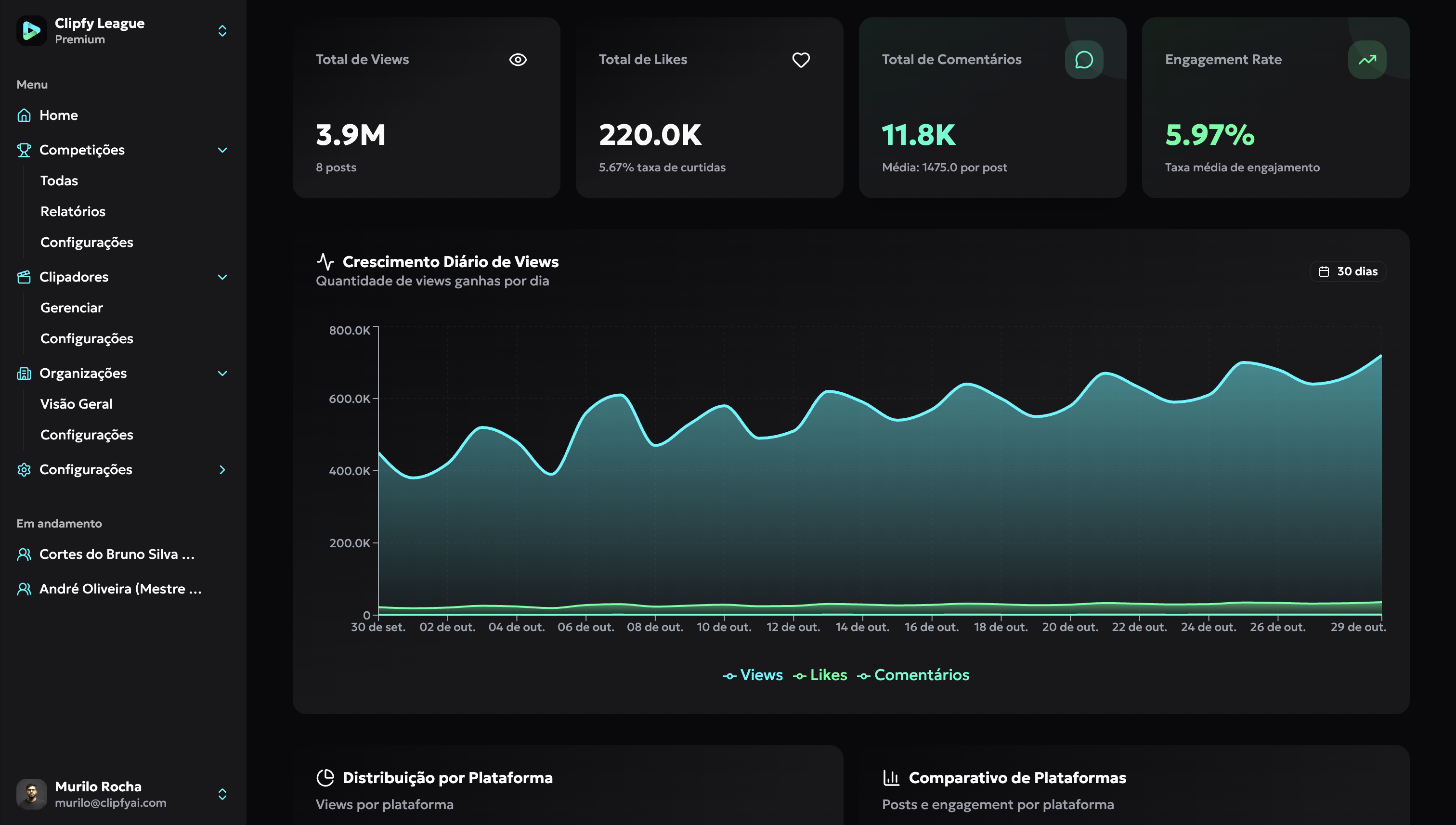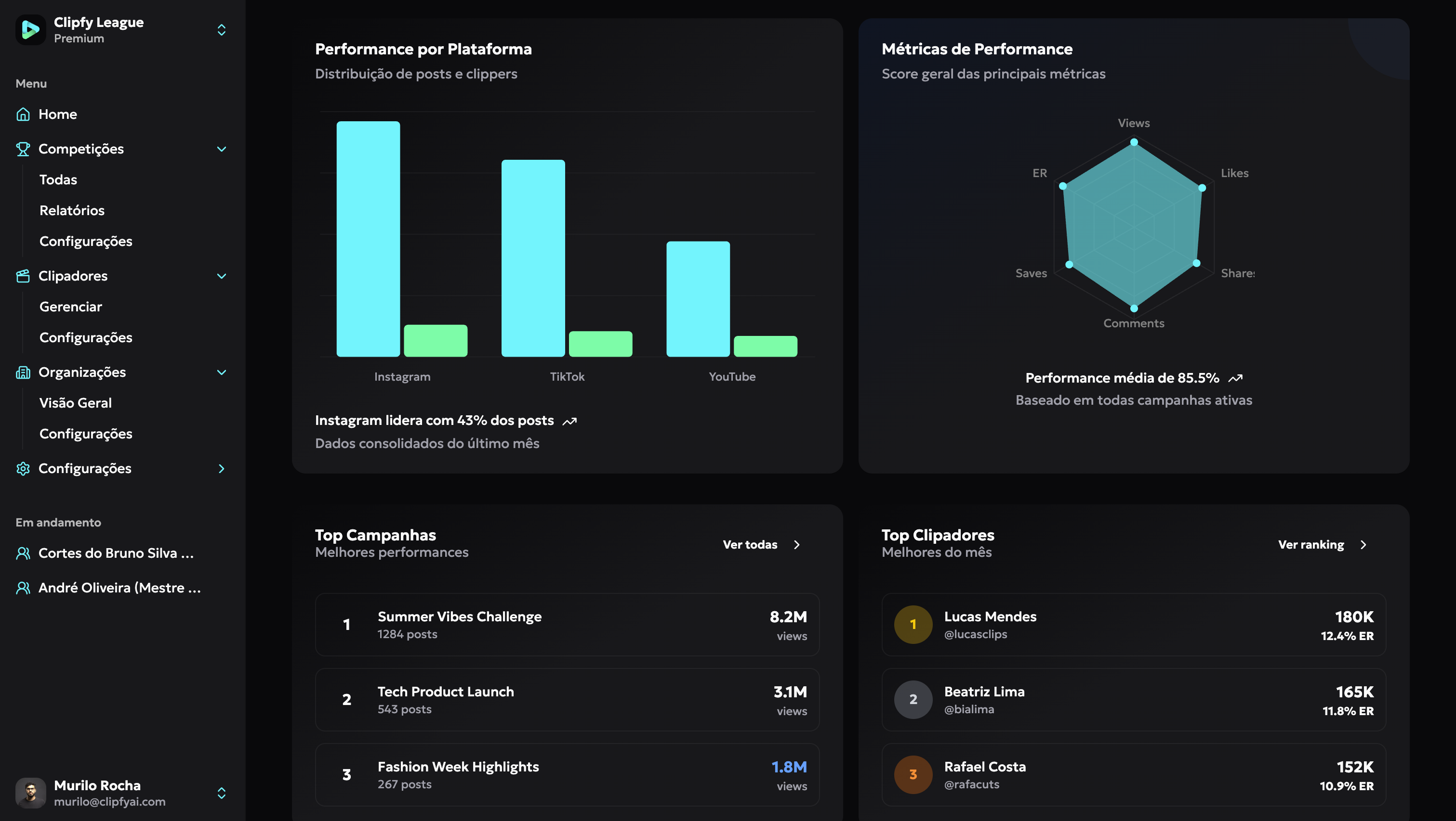 Tudo acontece dentro da Clipfy League: contagem de visualizações (métrica de disputa), curtidas, comentários, compartilhamentos, taxa de engajamento, contas mais engajadas, top criadores, vídeos mais engajados e evolução temporal — com filtros por plataforma e período.